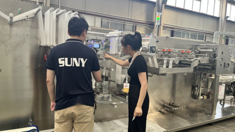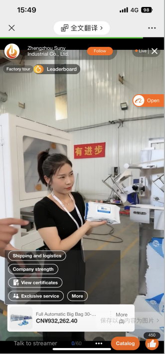 直播过程中,国内外销售人员用流利的英语介绍了各个湿巾生产线的结构和工作原理,如原料准备、定长裁断、计数堆叠等,展示了海瑞集团在卫材生产领域的实力和技术水平,为潜在客户提供全面的产品信息。