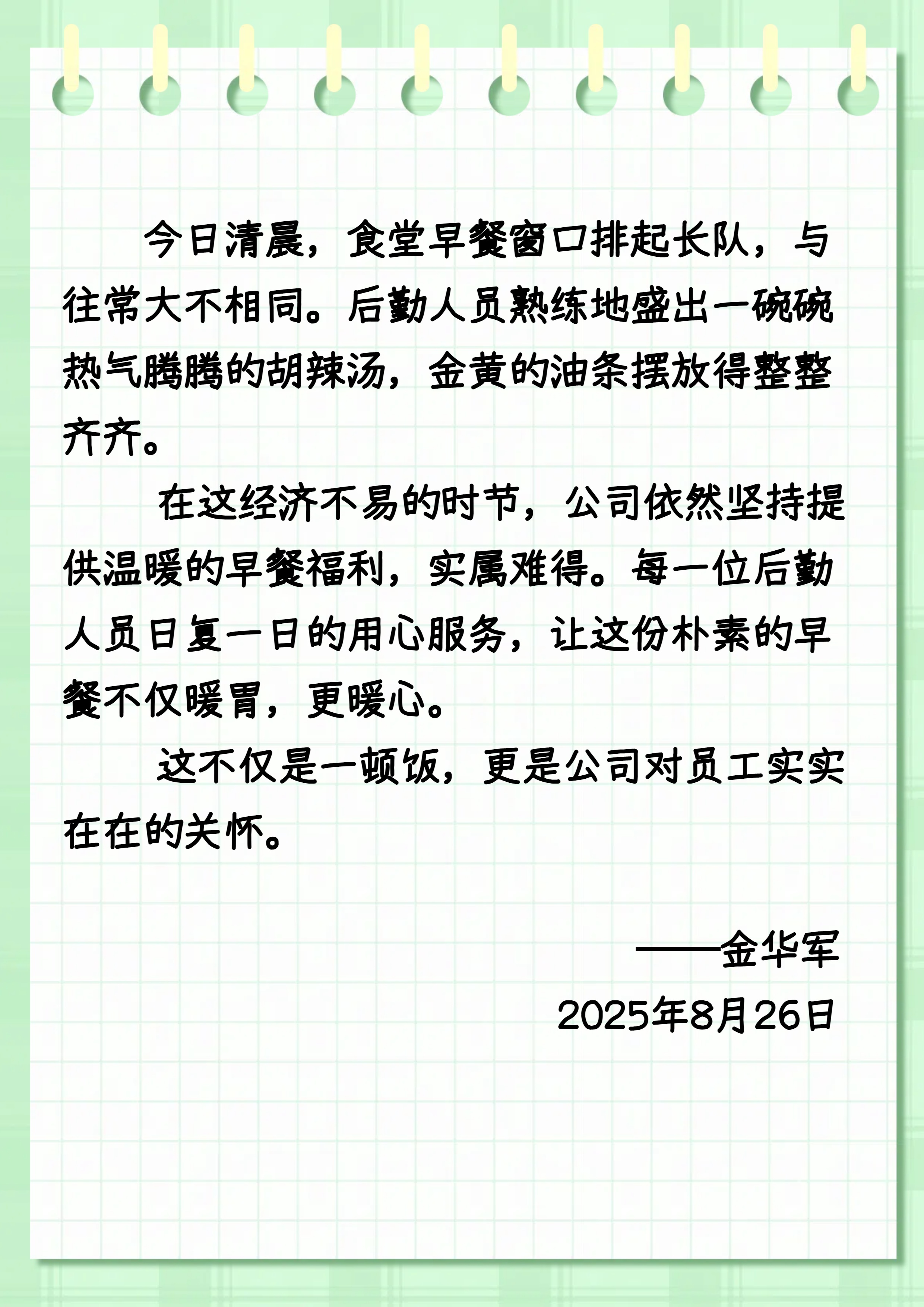 今日清晨,食堂的早餐窗口前早早排起了长队,与平日的稀疏人流形成鲜明对比。后勤人员动作娴熟,盛出一碗碗热气腾腾的胡辣汤,香气扑鼻;金黄的油条整齐码放,每一根都炸得外酥里嫩。在这经济并不宽裕的时期,公司依然坚持为员工提供免费而温暖的三餐,这份坚守,显得格外珍贵。