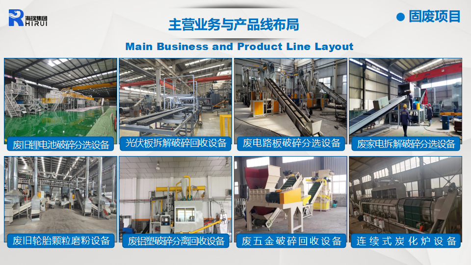 海瑞集团为集研发、生产、销售和技术服务为一体的自动化机械设备制造商,产品涵盖固废环保设备和无纺布卫材设备两大领域,其中固废设备有废光伏板拆解回收设备、锂电池破碎分选回收设备、废家电拆解破碎分选设备、废电路板破碎分选回收设备、连续式炭化设备、废旧轮胎颗粒磨粉设备、废铝塑破碎分离设备、废五金破碎分选设备、贵金属回收精炼设备等;卫材设备有湿巾机、棉柔巾机、包装机、装箱码垛机等。